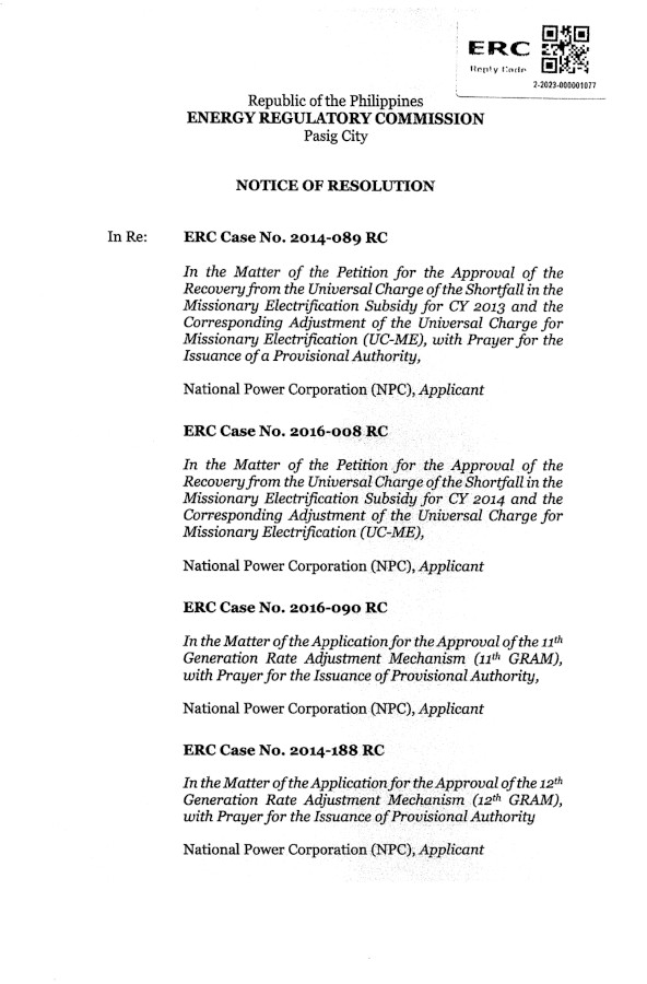 We wish to inform our member consumer owners (MCOs) that the Energy Regulatory Commission (ERC) rendered a decision dated March 22, 2023 approving the petition of the National Power Corporation for the recovery of the shortfall from the Universal Charge - Missionary Electrification (UC-ME) subsidy for calendar years 2013 and 2014.